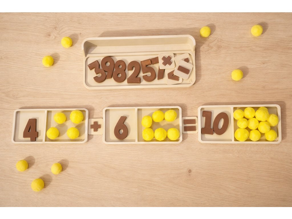 Do jednotlivých tácků umístěte číslice a matematické symboly podle zadání.