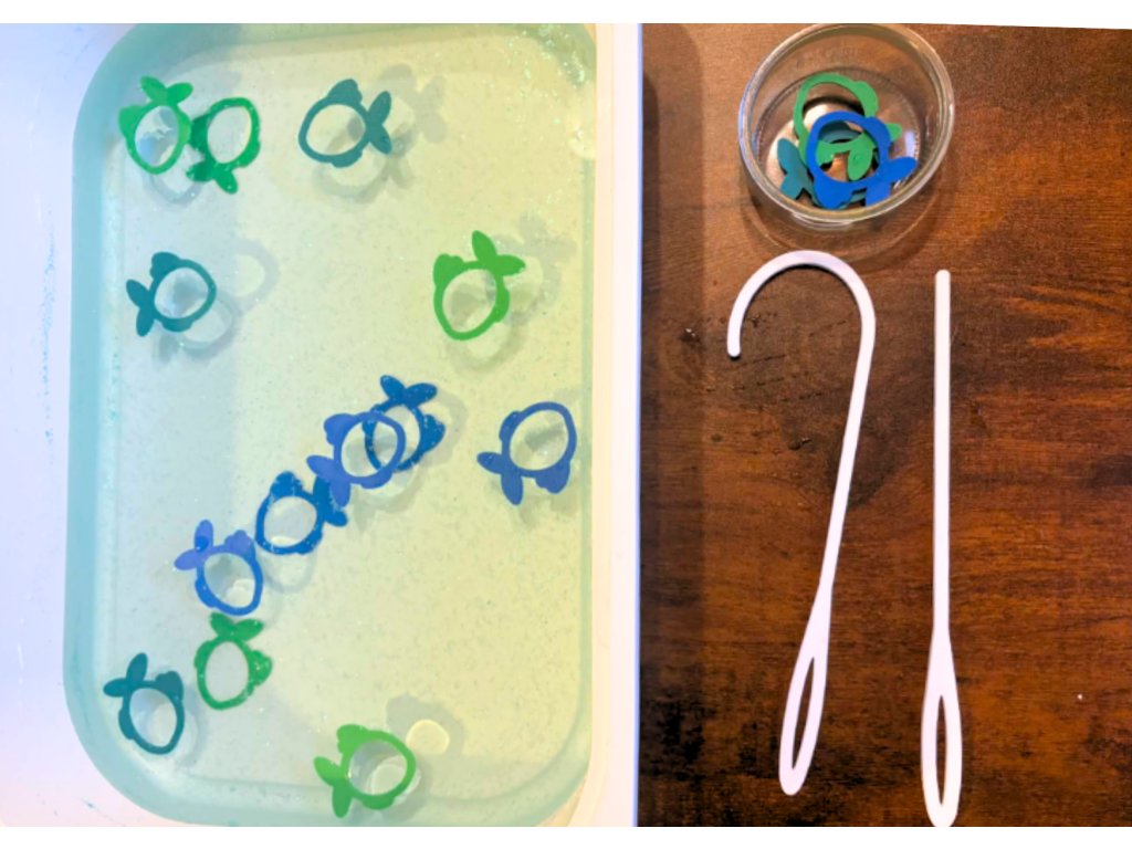 vhodné pro manipulaci, lov, třídění a navlékání v bezpečných senzorických materiálech,