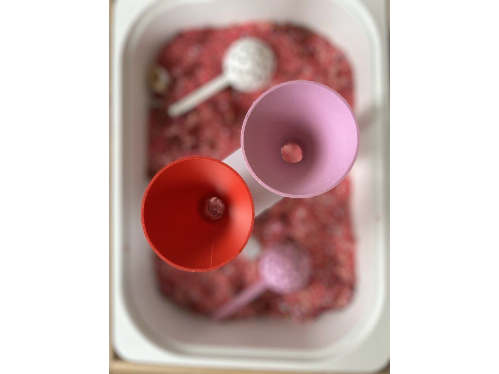 Do trychtýřů nasypávejte nebo pomocí dalších pomůcek přenášejte senzorický materiál.