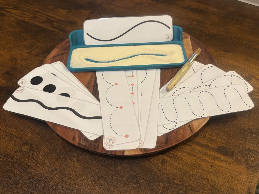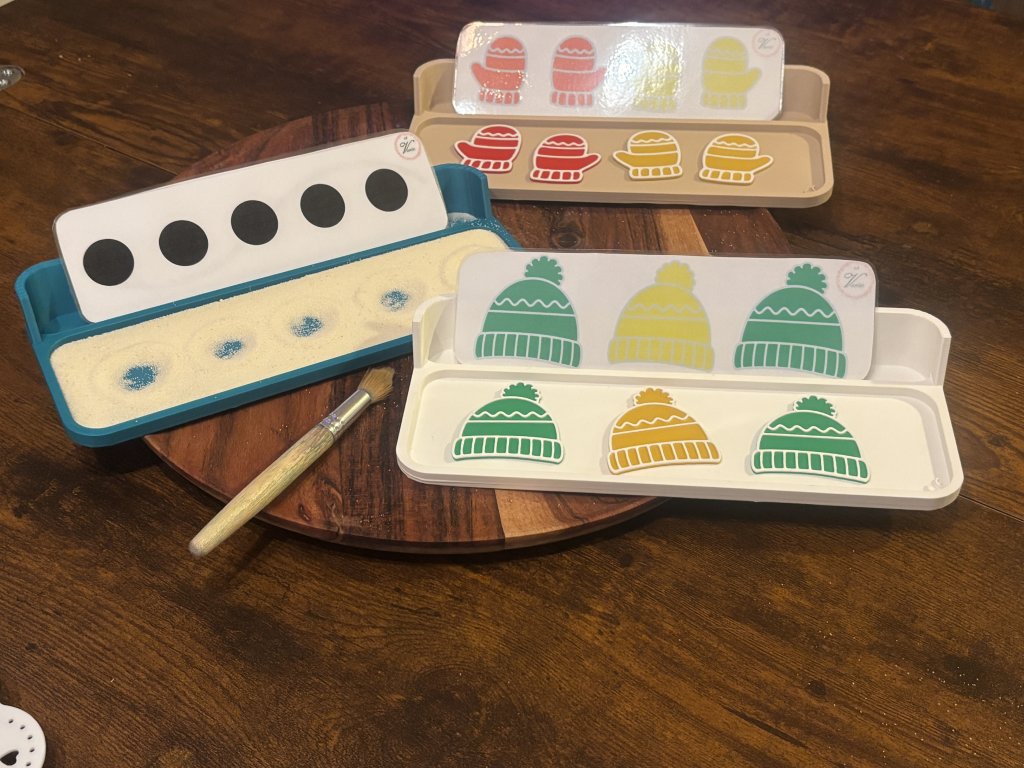 - Sypké materiály lze do tácku nasypat a pomocí prstů nebo vhodných pomůcek tvořit podle šablony (např. kreslení do mouky, krupice či písku).