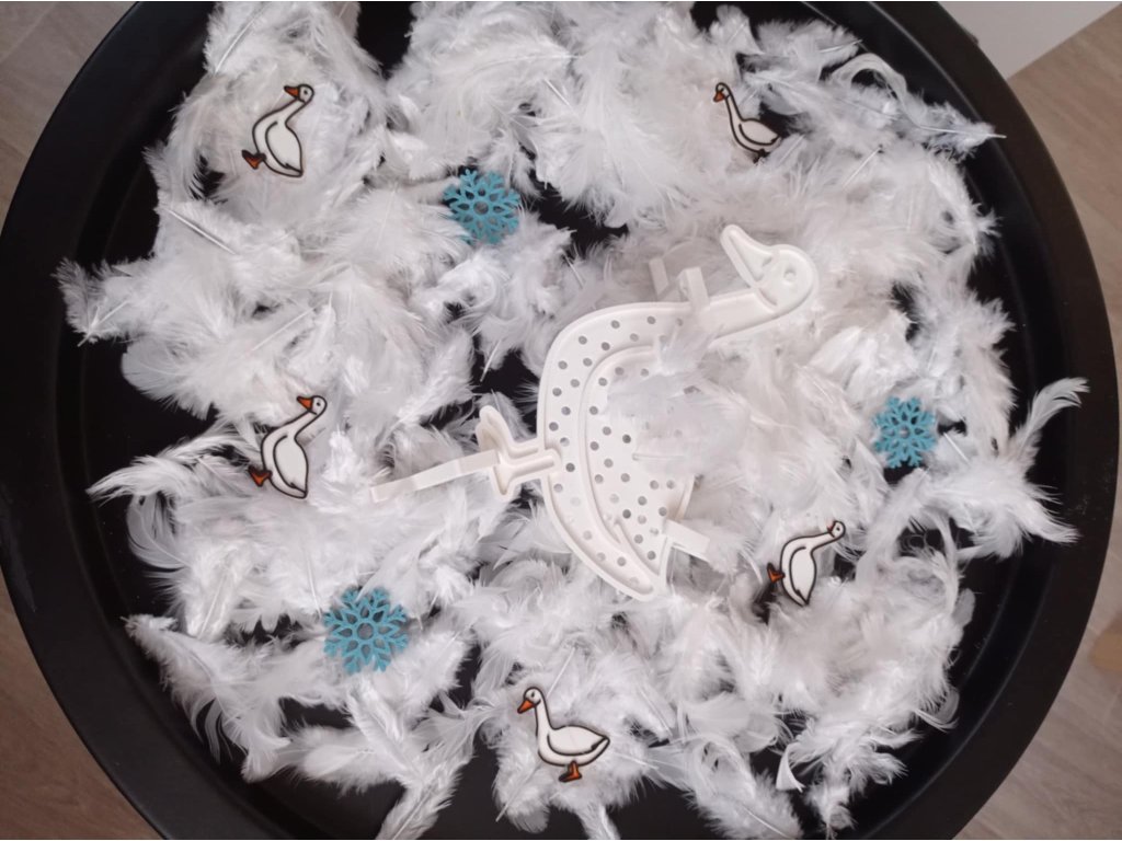 vhodné pouze pro manipulaci s bezpečnými, nepoživatelnými materiály (vatové tyčinky, peříčka, přírodniny, stuhy, gumičky apod.),