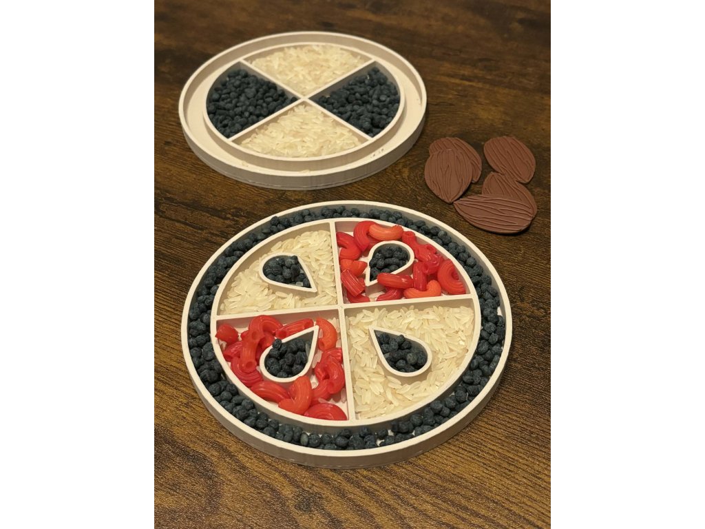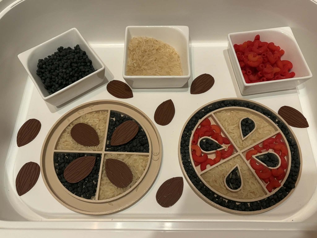 - Do jednotlivých částí tácku nasypávejte nebo vkládejte pouze bezpečné, nepoživatelné sypké materiály dle pedagogického nebo terapeutického záměru (např. rýže, pom-pony, větší těstoviny, fazole určené k manipulaci).